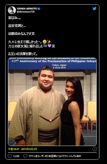 この時に晩餐会で15年ぶりに高安関と秋元才加さんは偶然ばったり出会うことができました。
