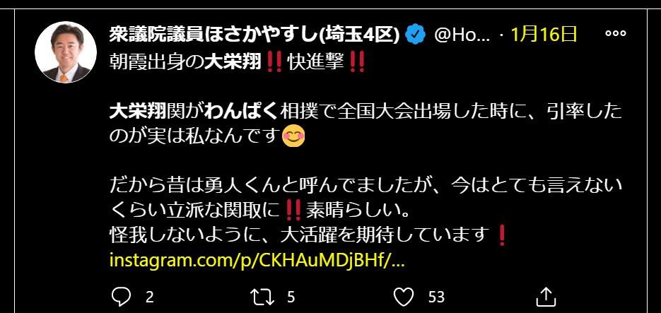 勇人(大栄翔)、初の優勝、本当におめでとう。今場所は今までにない連勝が続いて、ここまできたのが夢のようで実感が湧かなかった。本当にハラハラ、ドキドキで、口から心臓が出そうなくらいでした。最後の隠岐の海関との一番に勝って優勝が決まった瞬間は、思わず涙があふれ出ました。