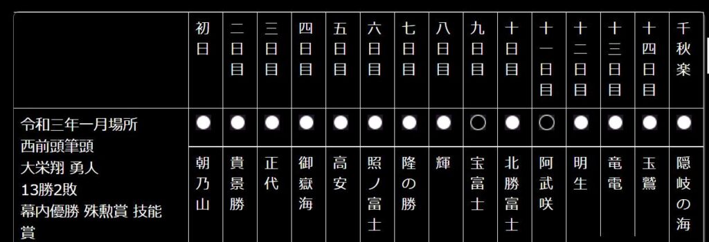 13勝2敗の成績で大関をすべて倒し三役も倒しての優勝で得意の突き押しの素晴らしい相撲で圧勝しとにかく絶好調でめちゃくちゃ強かったですね。平幕ながら大健闘していますね。