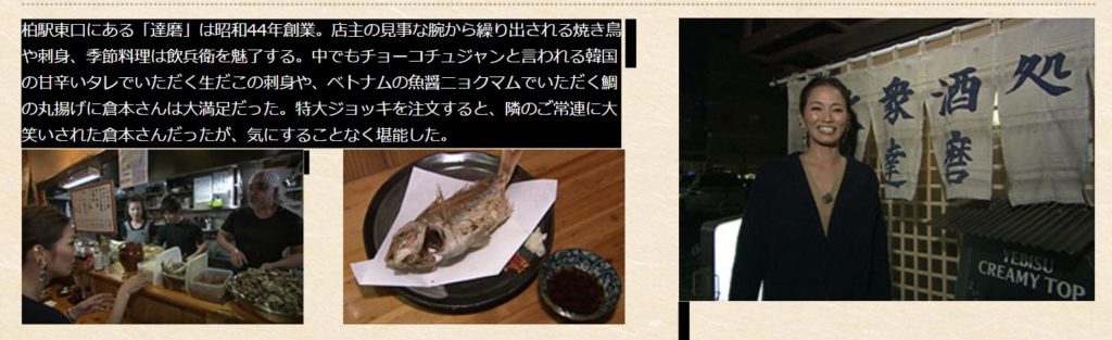 2016/11/23にはTBSの「おんな酒場放浪記」でお店が紹介されてタレントの倉本康子が来店しました
