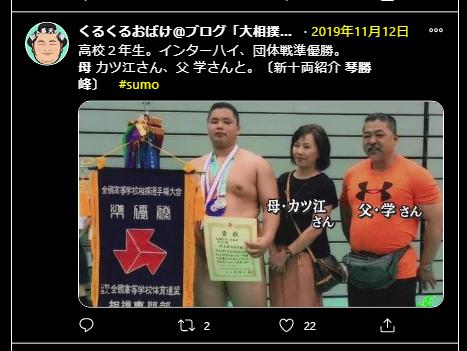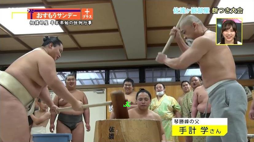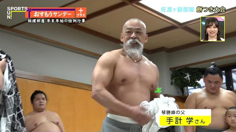 ボディービルダーです。これは2024年の1月に琴勝峰と琴手計と親子三人で餅つきをしている写真ですが、父親の学さんのムキムキの筋肉は年齢を感じさせませんね