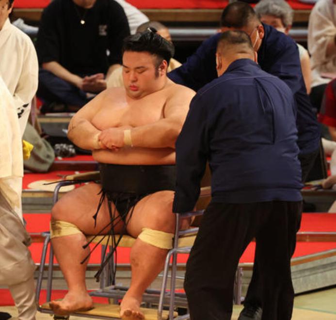 首を大きく痛めてしまい、取り組み後は支度部屋で動けなくなりましたました